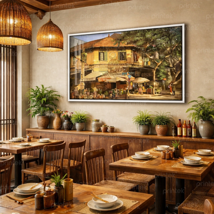 Một lưu ý quan trọng là không nên chọn ảnh quá nhiều chi tiết nhỏ nếu phòng khách nhỏ. Từ khoảng cách nhìn thực tế, tranh sẽ dễ bị rối và làm tường nặng nề hơn. Xem các mẫu tranh phong cảnh được chọn lọc bởi Printek tại đây