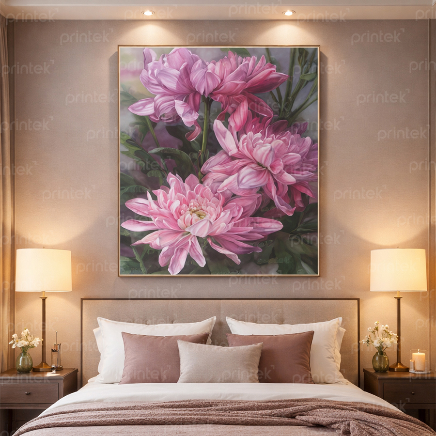 Bức tranh hoa mẫu đơn với sắc hồng phấn mềm mại, từng cánh hoa bung nở nhẹ nhàng mang đến cảm giác thư thái, êm dịu cho không gian phòng ngủ. Không quá rực rỡ, bức tranh tạo nên một điểm nhấn tinh tế, giúp căn phòng trở nên ấm áp và tràn đầy cảm xúc yêu thương.