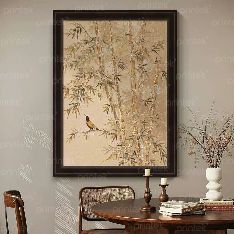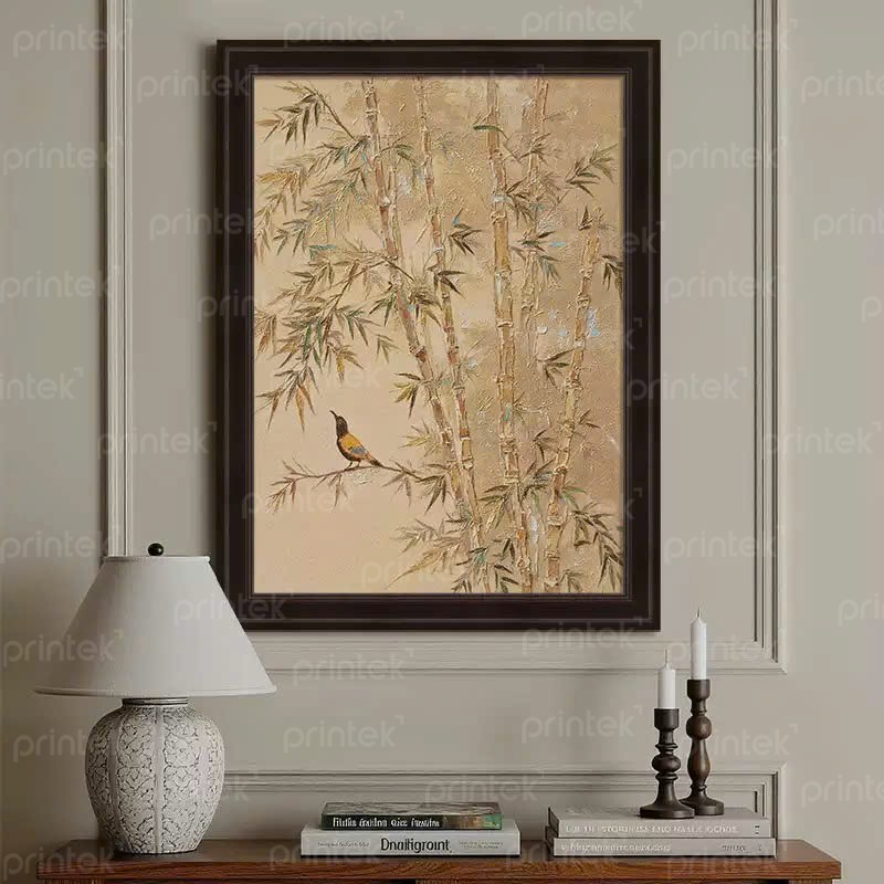 Không chỉ là một tác phẩm trang trí, bức tranh còn mang ý nghĩa phong thủy tốt lành: trúc tượng trưng cho sự kiên cường, thịnh vượng; chim mang đến sinh khí và an hòa. Treo tranh trong phòng khách, phòng ăn hay không gian tiếp khách sẽ tạo điểm nhấn nghệ thuật nhẹ nhàng nhưng đầy chiều sâu.