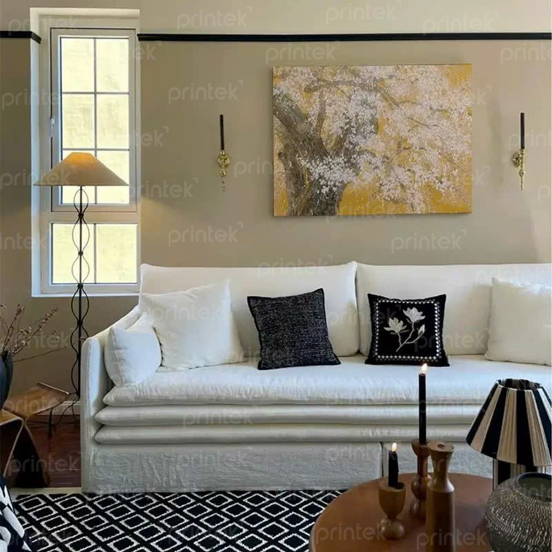 Sắc vàng kim tượng trưng cho phú quý, hoa trắng tinh khôi mang lại sự bình an. Bức tranh không chỉ là điểm nhấn nghệ thuật cho không gian sống mà còn là biểu trưng của sự thịnh vượng và sức sống mãnh liệt. Một gốc cổ thụ vững chãi, che chở cho những mầm hoa đua nở, như lời chúc về một gia đình sung túc, bền vững theo thời gian.