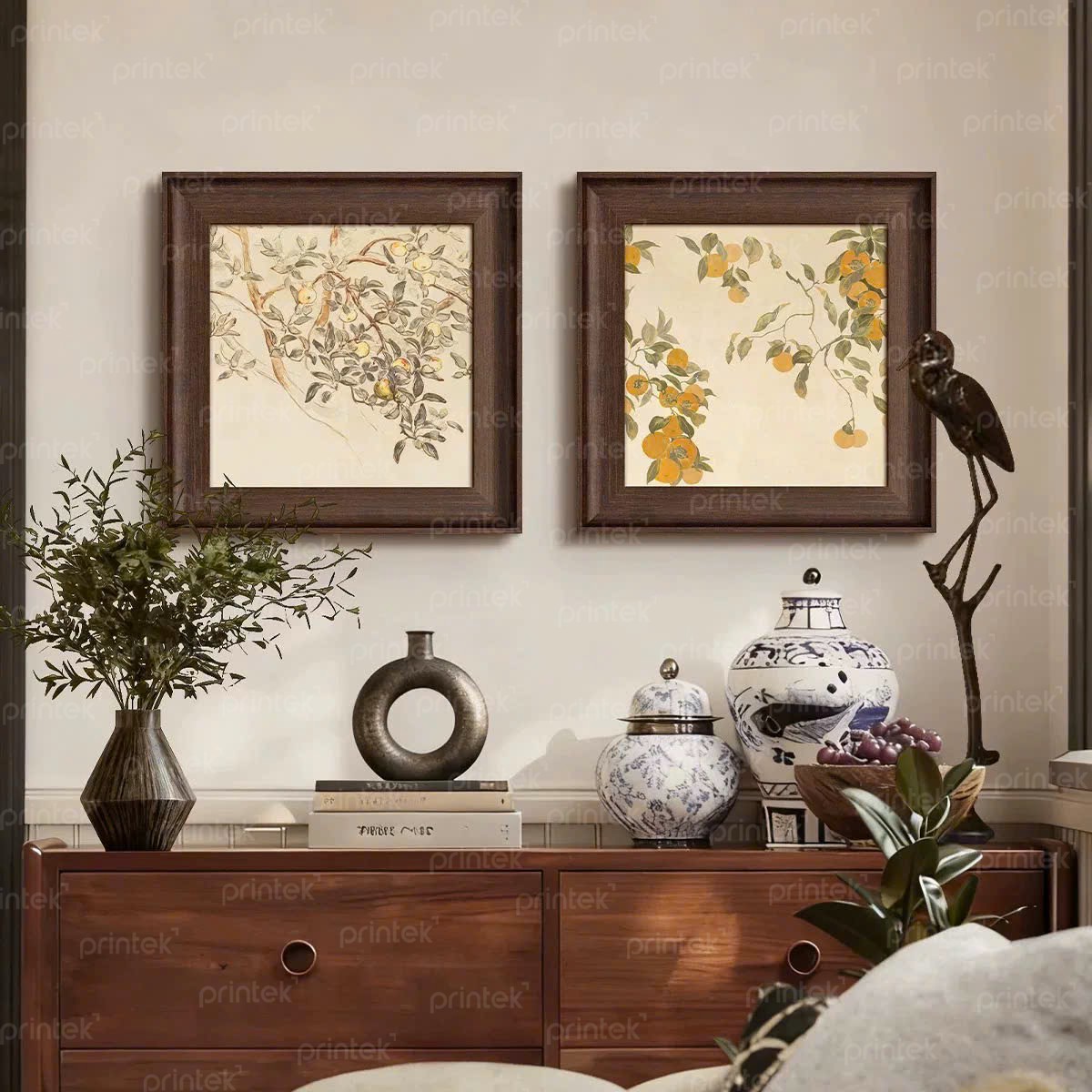 Bộ tranh Indochine "Mùa quả chín" tái hiện vẻ đẹp dung dị mà tinh tế của thiên nhiên Á Đông qua hình ảnh cành quả trĩu nhẹ, lá mềm mại trên nền màu ngà ấm. Nét vẽ mộc mạc, uyển chuyển gợi cảm giác hoài niệm, bình yên – tinh thần cốt lõi của phong cách Indochine.