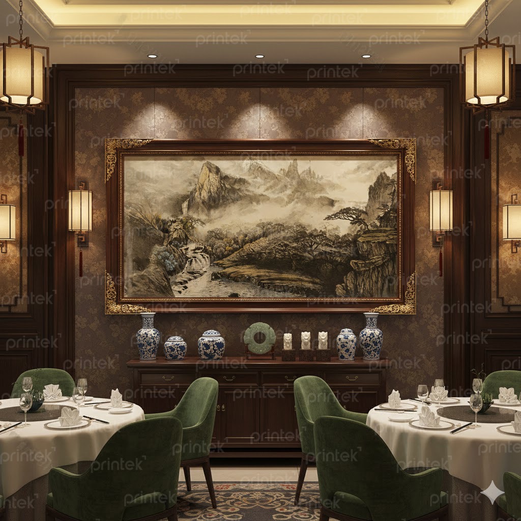 Giữa không gian ấm cúng của những ánh đèn vàng, bức tranh sơn thủy hiện lên như một cửa sổ mở ra thế giới thần tiên. Từng nét vẽ tái hiện sự hùng vĩ của núi non, sự mềm mại của mây ngàn, tạo nên một dòng chảy năng lượng phong thủy cát tường cho nhà hàng.
